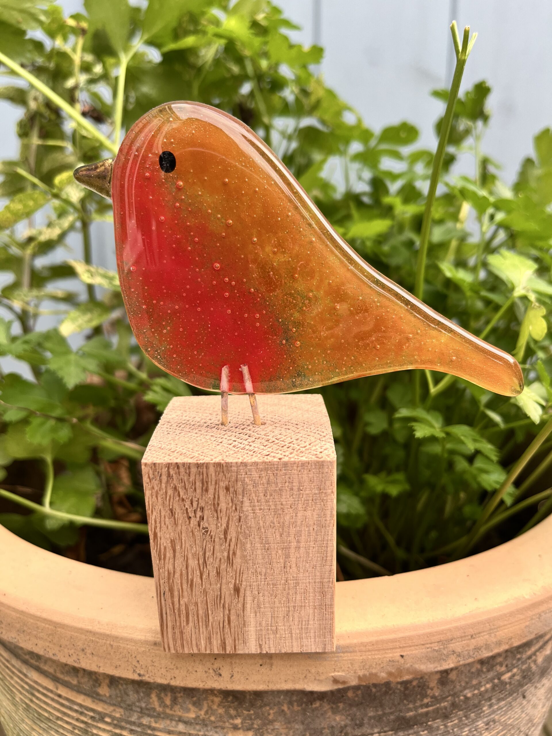 Hand cut glass Robin made using glass powders (7-8cm*11-12cm) on wooden stand